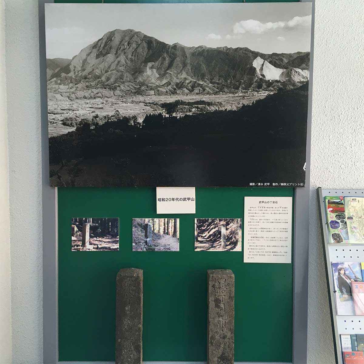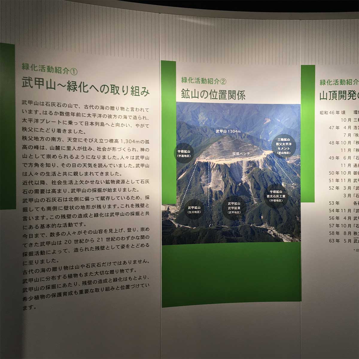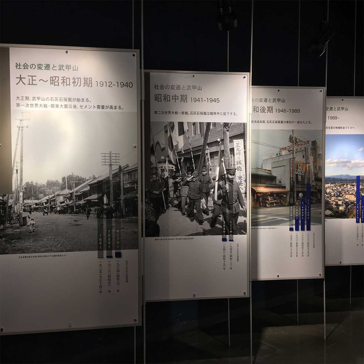 「社会の変遷と武甲山」という吊りパネルでは、時代と共に歩んできた武甲山採掘の状況・武甲山関連企業の現況について説明しています。