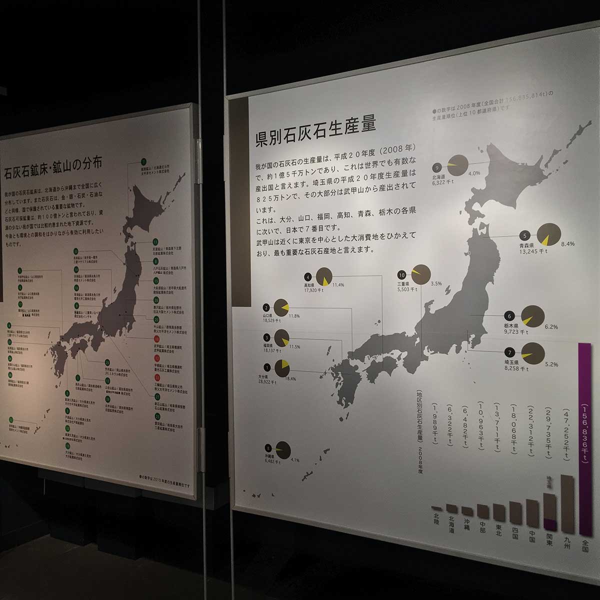 「石灰石鉱床・鉱山の分布」「県別石灰石の生産量」の2枚の吊りパネルでは、日本の主な石灰石鉱山、石灰石関連企業と、埼玉県が日本でも有数の産出県であることを示しています。