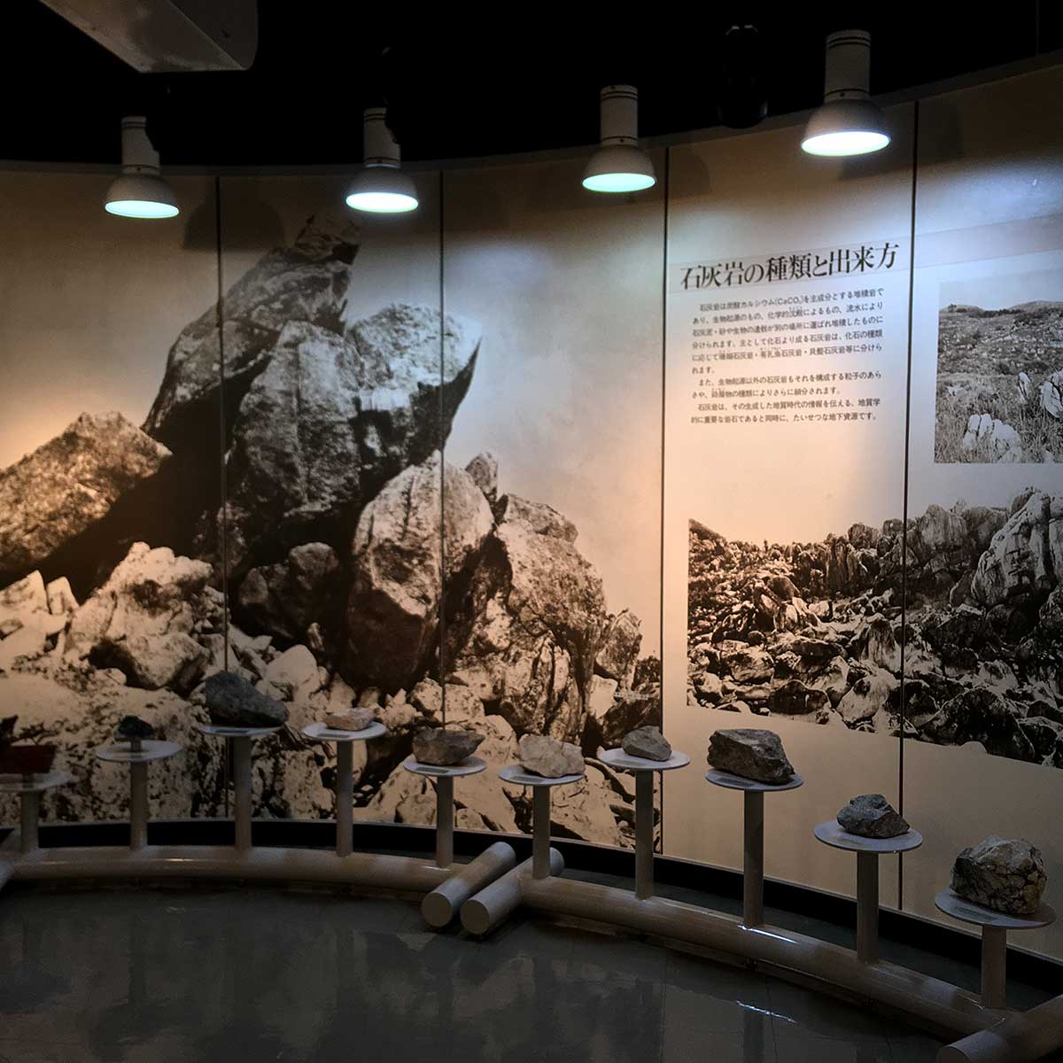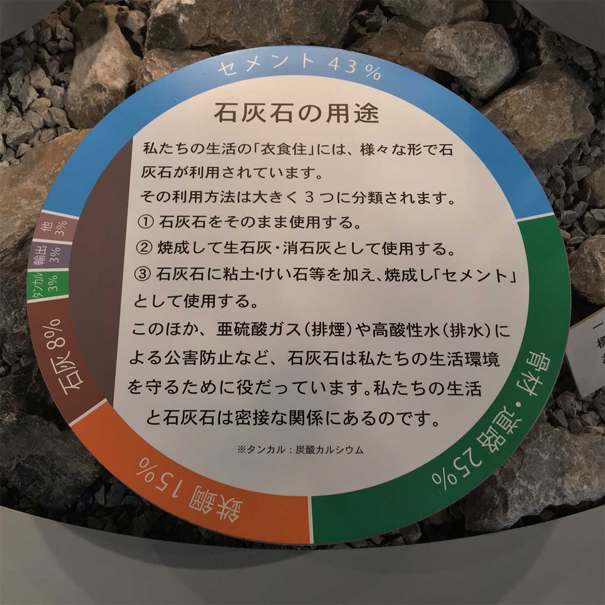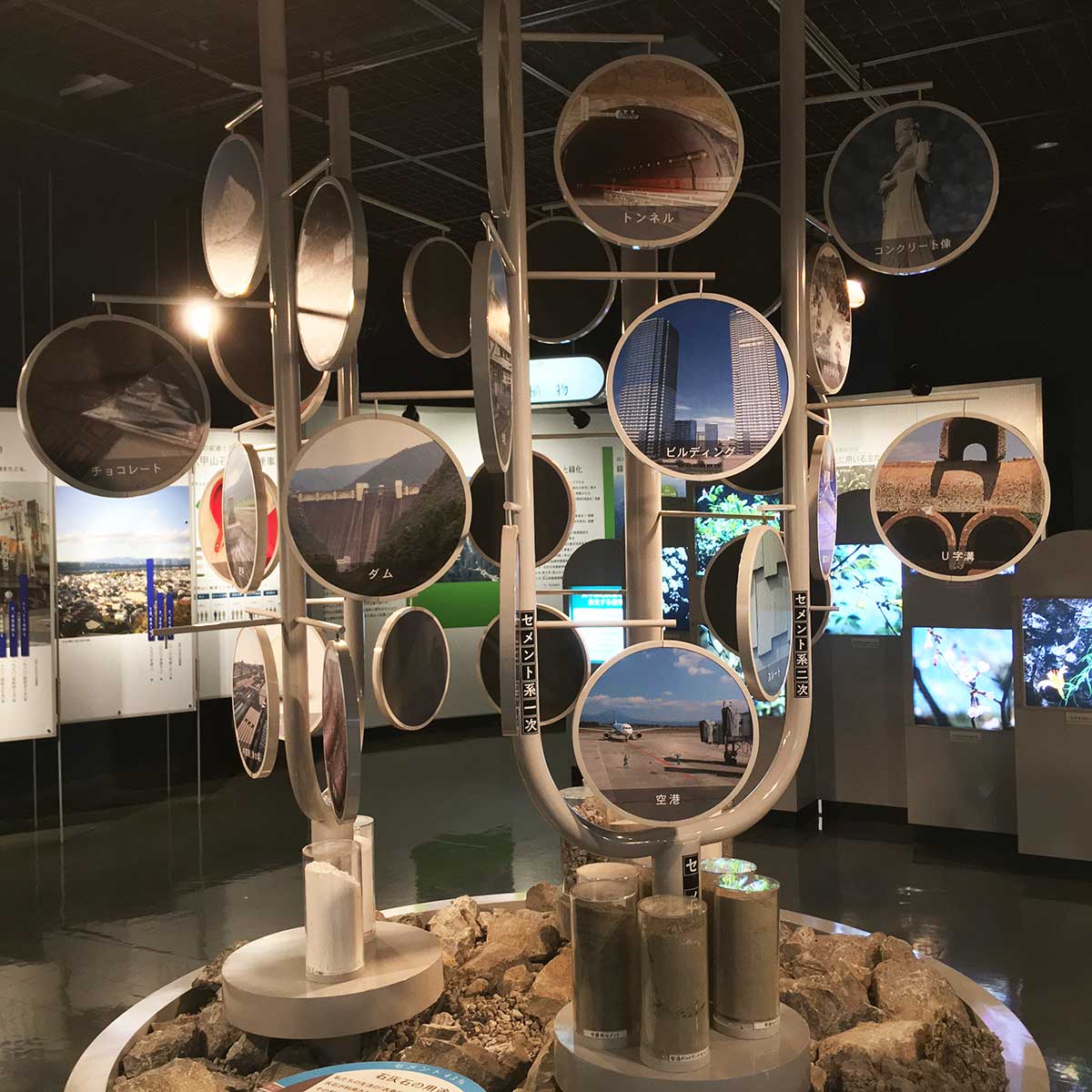 「石灰石の用途」の部分では、セメントとして利用するもの、石灰石そのものを利用するもの、石灰石を焼いて利用するものの3本の柱に分けられ、44枚の丸型カラー写真で用途を示し、私達の生活に広く利用されていることを展示しています。