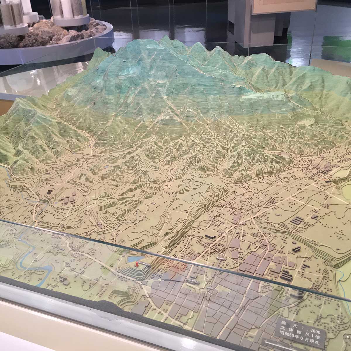 展示室の中央に、武甲山を中心とした立体地形が展示してあります。赤くポイントされているのが、当資料館で、すぐ前に「姿の池」があり、武甲山が南東方向にそびえています。いま石灰岩を採掘しているのは、主として山の北面です。