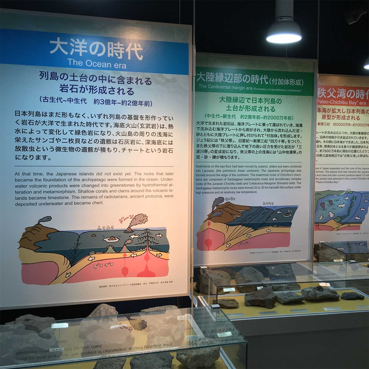 「秩父の大地のなりたち」「大洋の時代」「大陸縁辺部の時代(付加体形成)」「古秩父湾の時代」「列島の時代」という、5枚の吊りパネルで、日本列島と秩父山地のおいたちを説明しています。