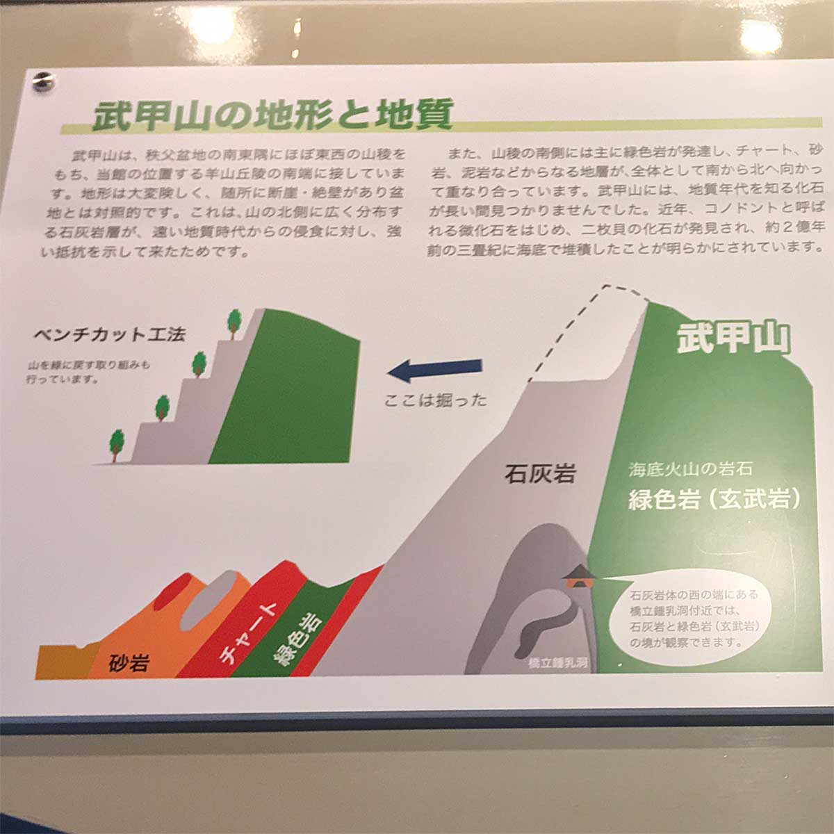 地質図で見ると分るように、石灰岩の背後は比較的風化しやすい緑色岩などで、石灰岩をカバーロック(岩石のおおい)として残し、採掘方法もベンチカット(階段状に掘る)とし、ベンチに樹木などを植えて緑化するように施工しています。