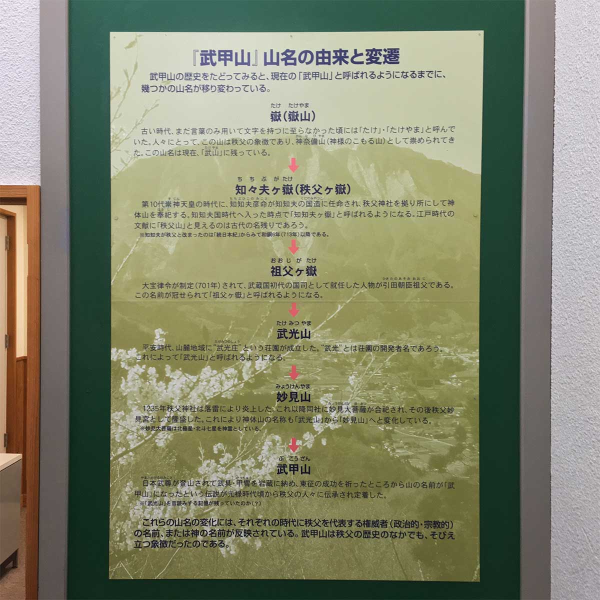 昔、大化改新(645年)の後、埼玉・東京・神奈川(の一部)は武蔵国として統一され、それまでの知知夫は「秩父」と改められました。ヤマトタケルが甲冑を岩室に奉納した伝説に由来する武甲の名も、江戸期以前は、古い順にタケ・ダケ(嶽)、タケヤマ(嶽山)、秩父嶽、祖父ヶ嶽、武光山、妙見嶽(名剣山)、妙見山、そして武甲山と、歴史の曲折点とともに変遷してきています。