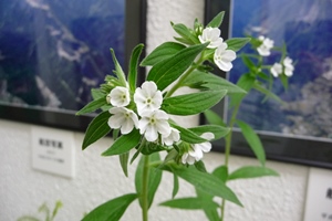「ムラサキ」はレッドデータブック(環境省)の絶滅危惧ⅠB類にランクされている希少植物です。展示中のムラサキは茎の長さが65cmとやや短い35cmの2鉢で、茎の上部で枝分れし直径1cmほどの小さな白色の花が次々と咲きます。他に「オオモノジガサ」1鉢、「クジャクシダ」1鉢も展示しています。この特別展示は秩父太平洋セメント㈱様のご協力により行っております。皆様のご来館お持ちしております。展示は6月13日(金)まで。火曜日休館