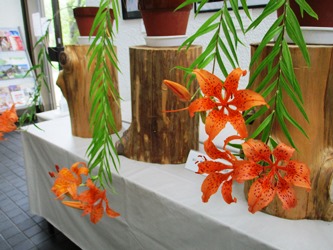ミヤマスカシユリは武甲山で1941年(昭和16年)に発見された野生のユリです。埼玉県のレッドデータブックでは絶滅危惧に分類されています。希少な植物の保護増殖に取り組む秩父太平洋セメント㈱のご協力をいただき「ミヤマスカシユリ」の特別展示を行っています。茎は垂れ下がり長いもので約80センチあり、その先端に鮮やかなオレンジ色の花が上向きに咲きます。